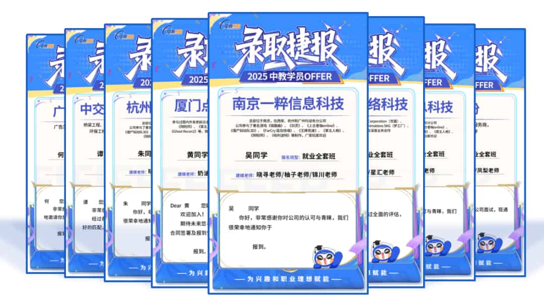 学习的终点是职业发展,因此,今年中教进一步完善了“职业护航计划”,为优秀学员提供从岗位开发、岗位推荐、简历优化、作品集指导到面试等流程的就业支持。通过企业推荐、线上宣讲等多元渠道,助力多名优秀学员顺利获得心仪offer,进入各大游戏公司及互联网企业,实现职业发展飞跃。