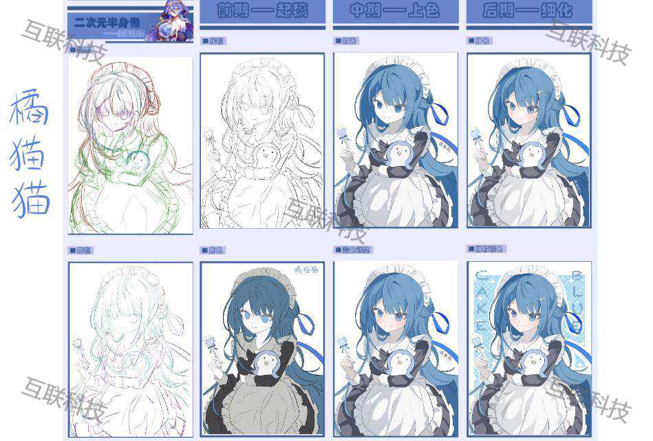 这是一张二次元半身像绘画创作的步骤分解图,展示了从起稿到完成作品的全流程,涉及这些知识点和步骤:一、前期起稿概念:起稿是...